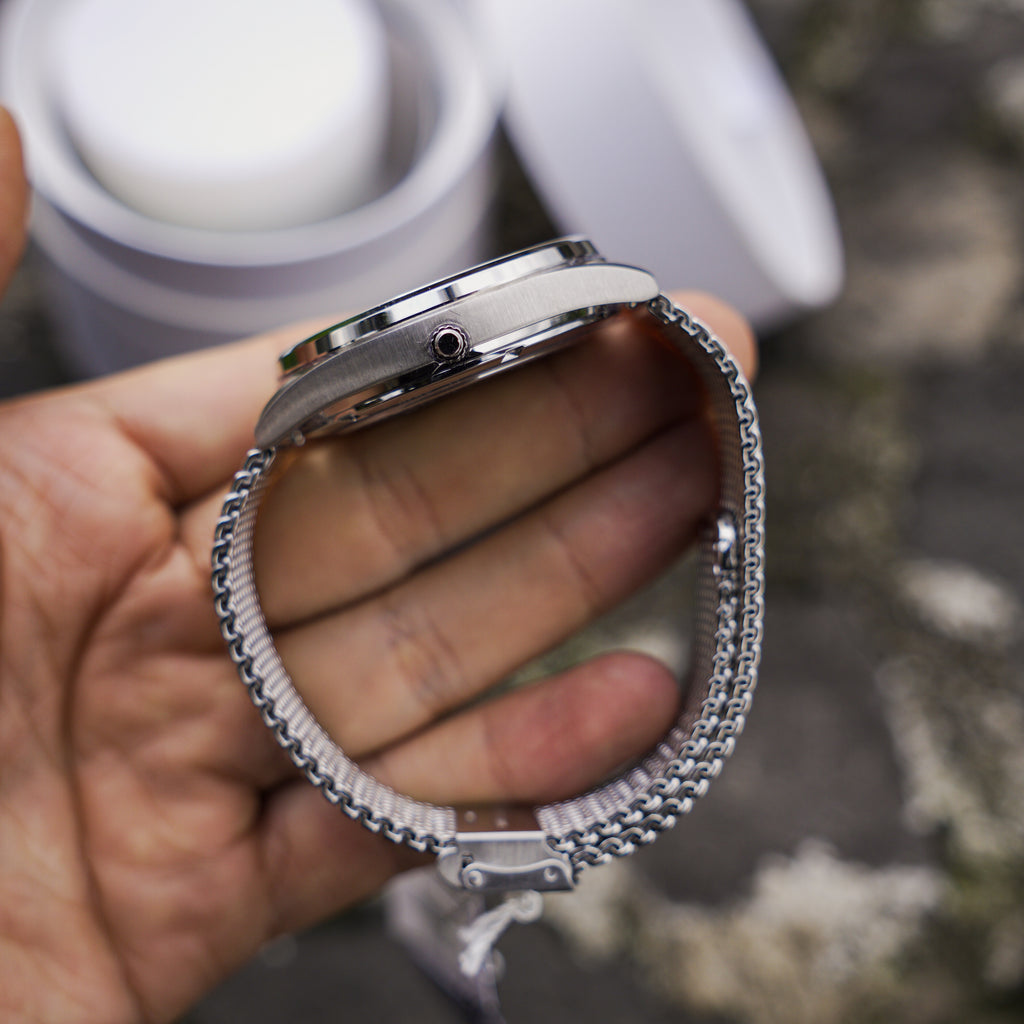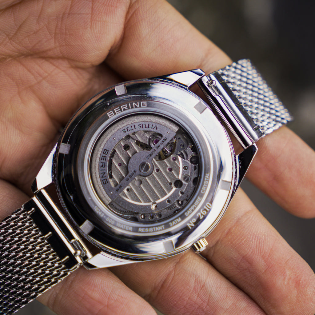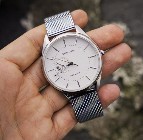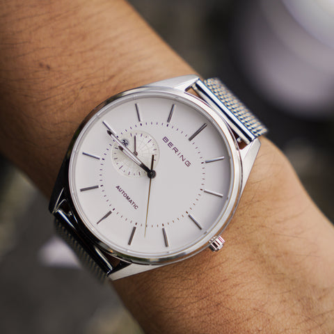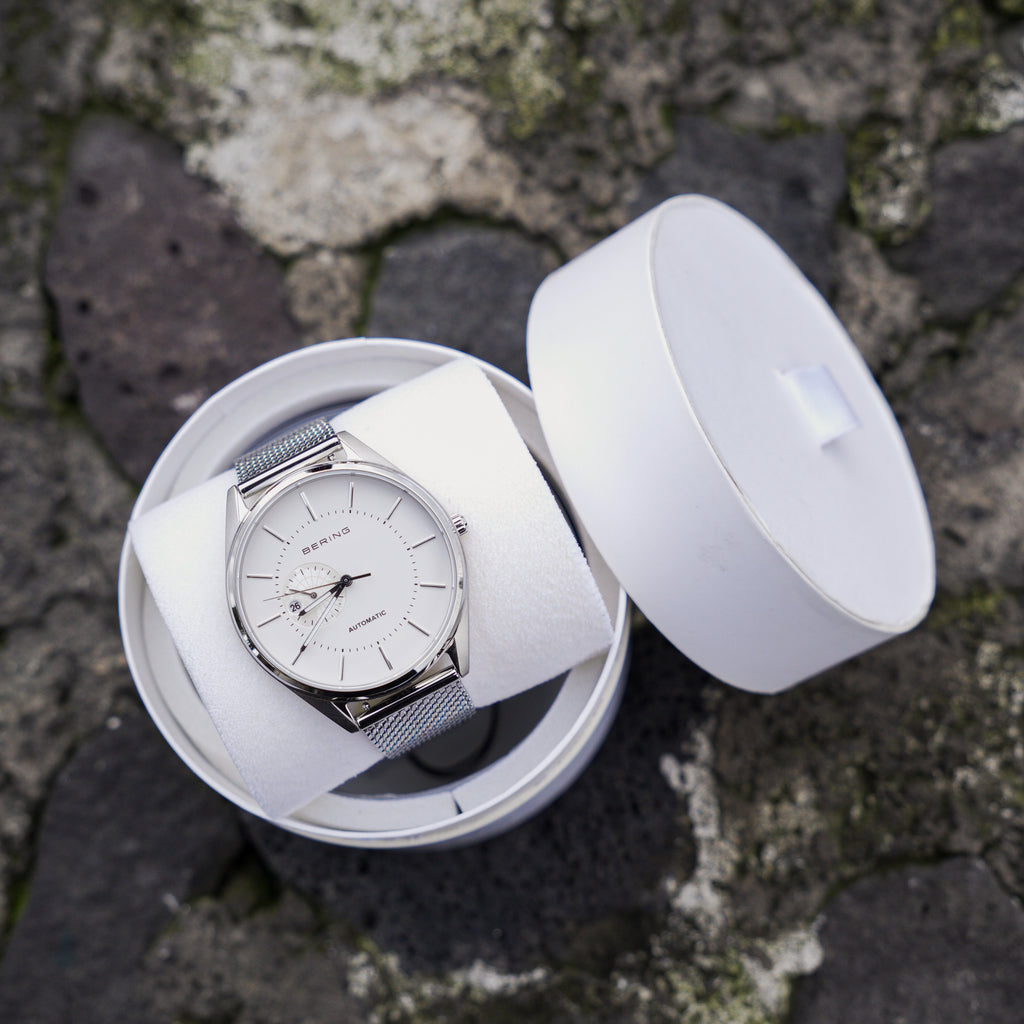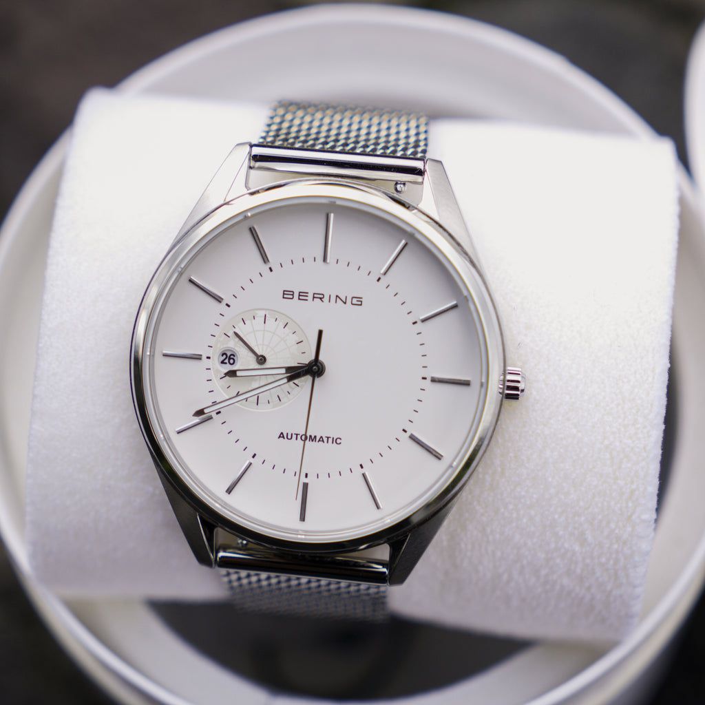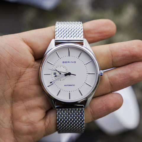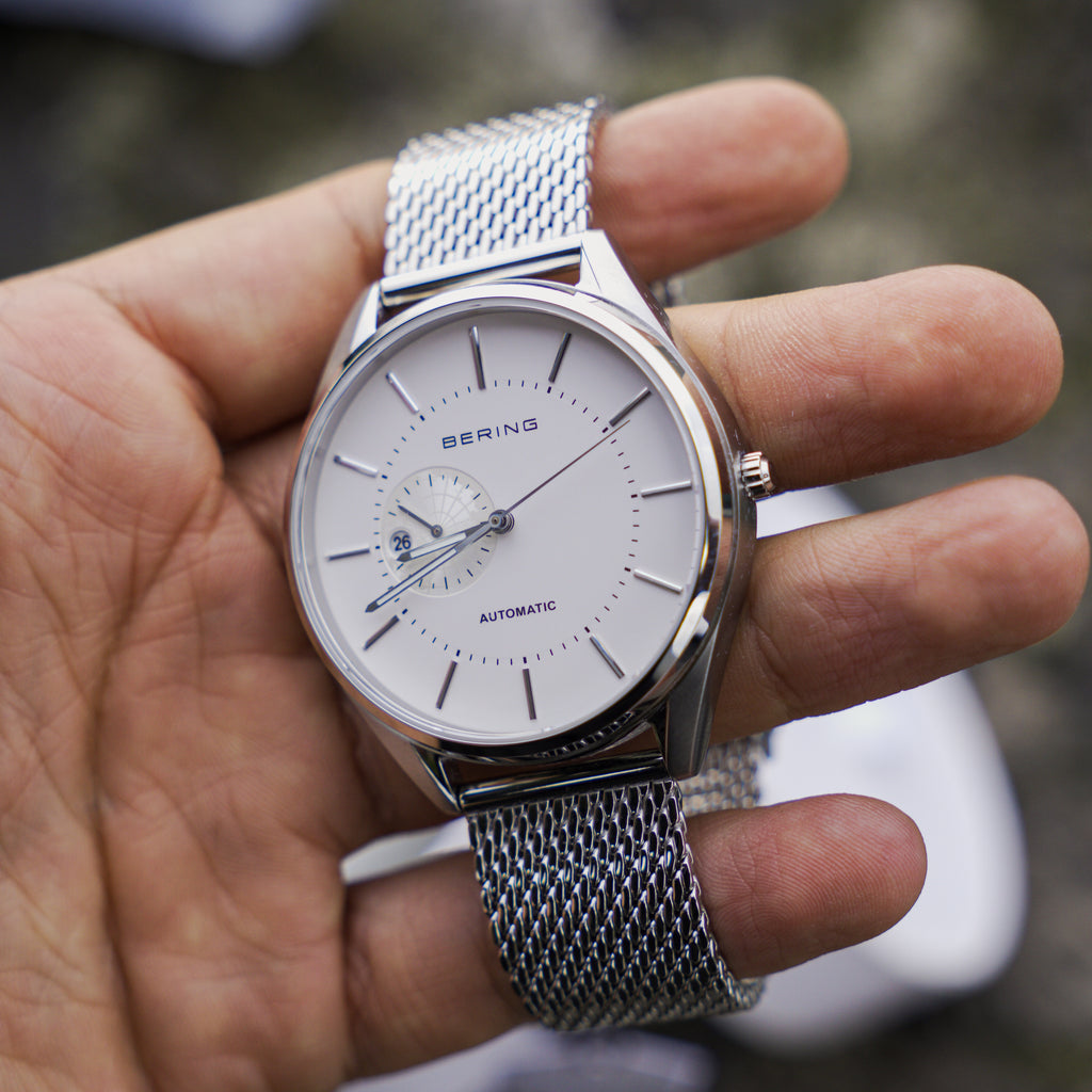 Este BERING 16243-000 es un reloj de diseño minimalista con estética escandinava: su esfera blanca limpia, índices bastón y correa tipo malla Milanesa le dan un aire elegante pero sobrio. El movimiento automático lo convierte en un reloj mecánico con alma clásica. Funciona muy bien con estilo casual elegante: camisas blancas, blazer ligero o atuendos monocromáticos.