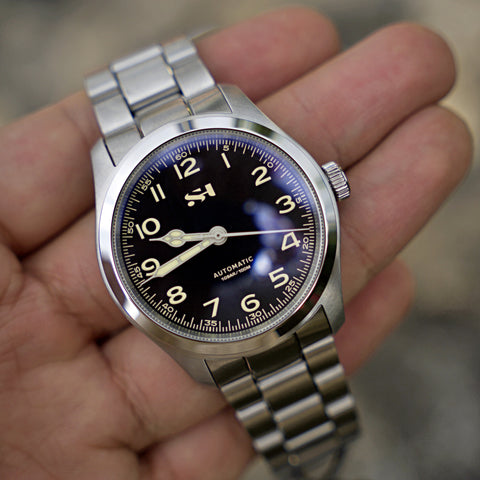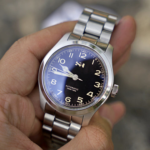 El SH9, Homenaje al Hamilton Khaki Field Automatic H70405130 es un reloj que captura a la perfección ese espíritu militar clásico que caracteriza a la marca, pero con la solidez y elegancia que se espera de un reloj moderno. Su caja de 38 mm en acero inoxidable tiene proporciones impecables, fáciles de llevar y muy favorecedoras para el día a día. El movimiento PT5004 con 36 horas de reserva de marcha elevan el conjunto a una pieza duradera y confiable. Es un reloj que combina perfecto con ropa casual. Camisas, mezclilla, botas y también puede acompañar un estilo smart-casual relajado. Como detalle interesante, este modelo mantiene la estética de los relojes que Hamilton fabricó para los soldados estadounidenses, lo que le da esa sensación de herramienta auténtica con historia real detrás.